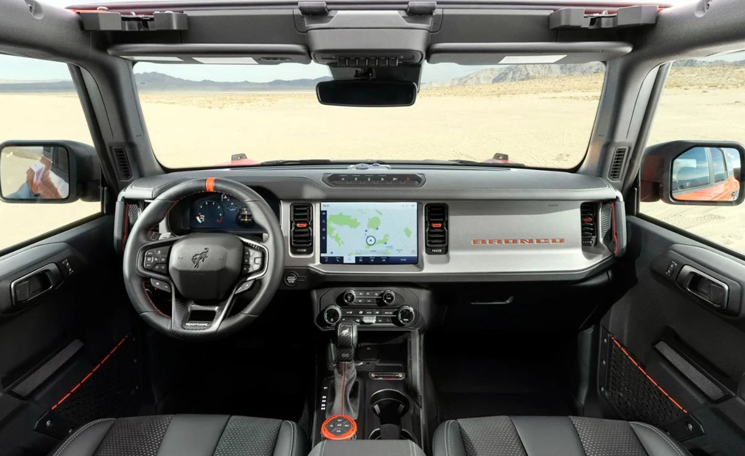Functional aesthetics dominate every inch of the Bronco Raptor’s design. It rides on massive 37-inch BFGoodrich KO3 all-terrain tires, mounted on forged beadlock-capable wheels designed for both rugged terrain and track stability. A new modular roof design allows for quick configuration changes—from a fully enclosed setup to an open-air experience. The adaptive LED light bar, mounted seamlessly on the roofline, integrates with the vehicle’s off-road sensors, automatically adjusting brightness based on terrain conditions. Every detail, from its ground clearance to its vented hood, embodies purpose-driven engineering.